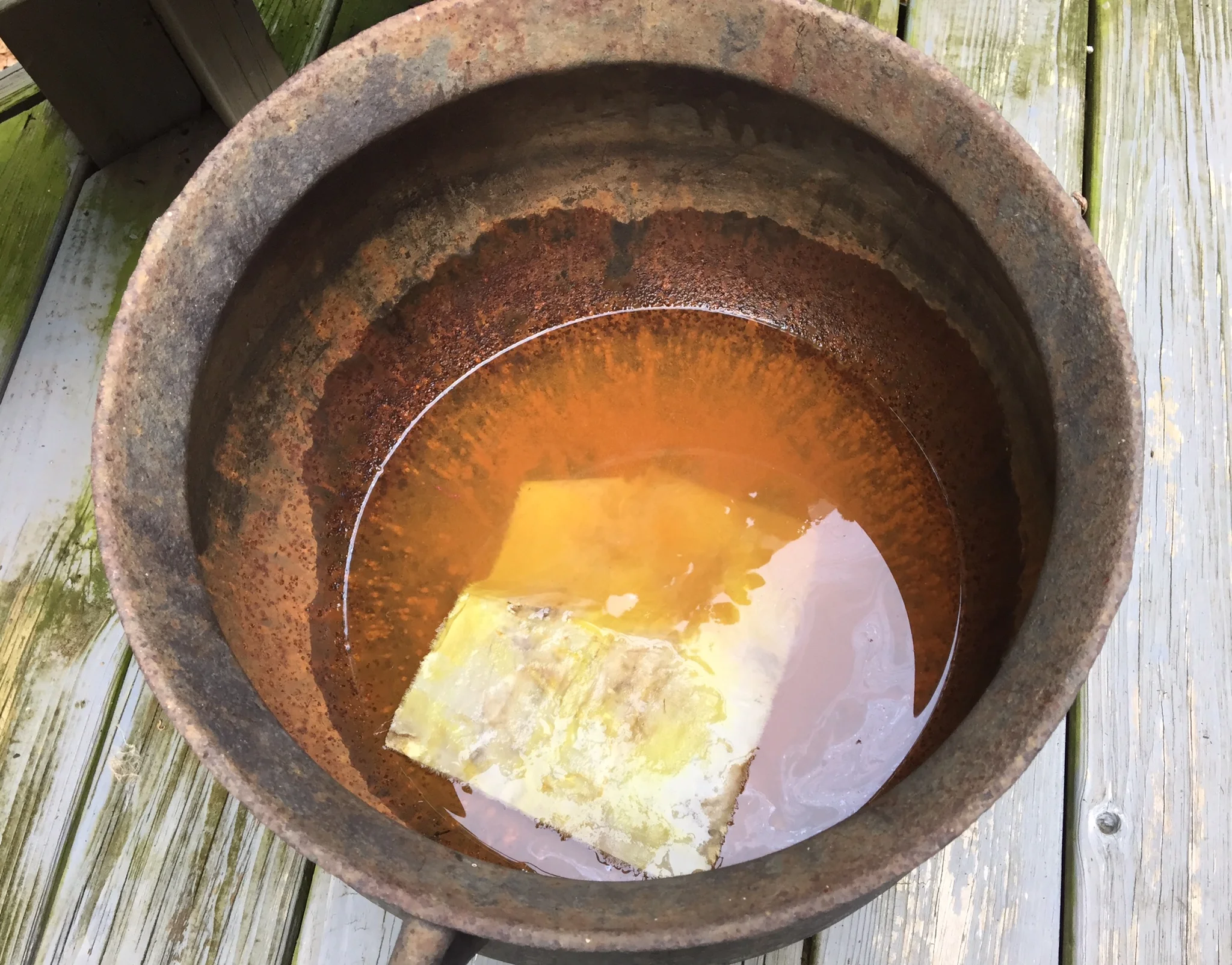 Now, just to see what would happen, I've put them all into the rusty old iron pot. The liquid is rain water and some white vinegar. I probably should have torn each piece in half, so I could compare before and after. I'm sure I'll get better at this. For now, I just want to have some fun. I don't want to get bogged down in record keeping yet. Once I start to have more of a feel for it all, then I'll start keeping meaningful notes.