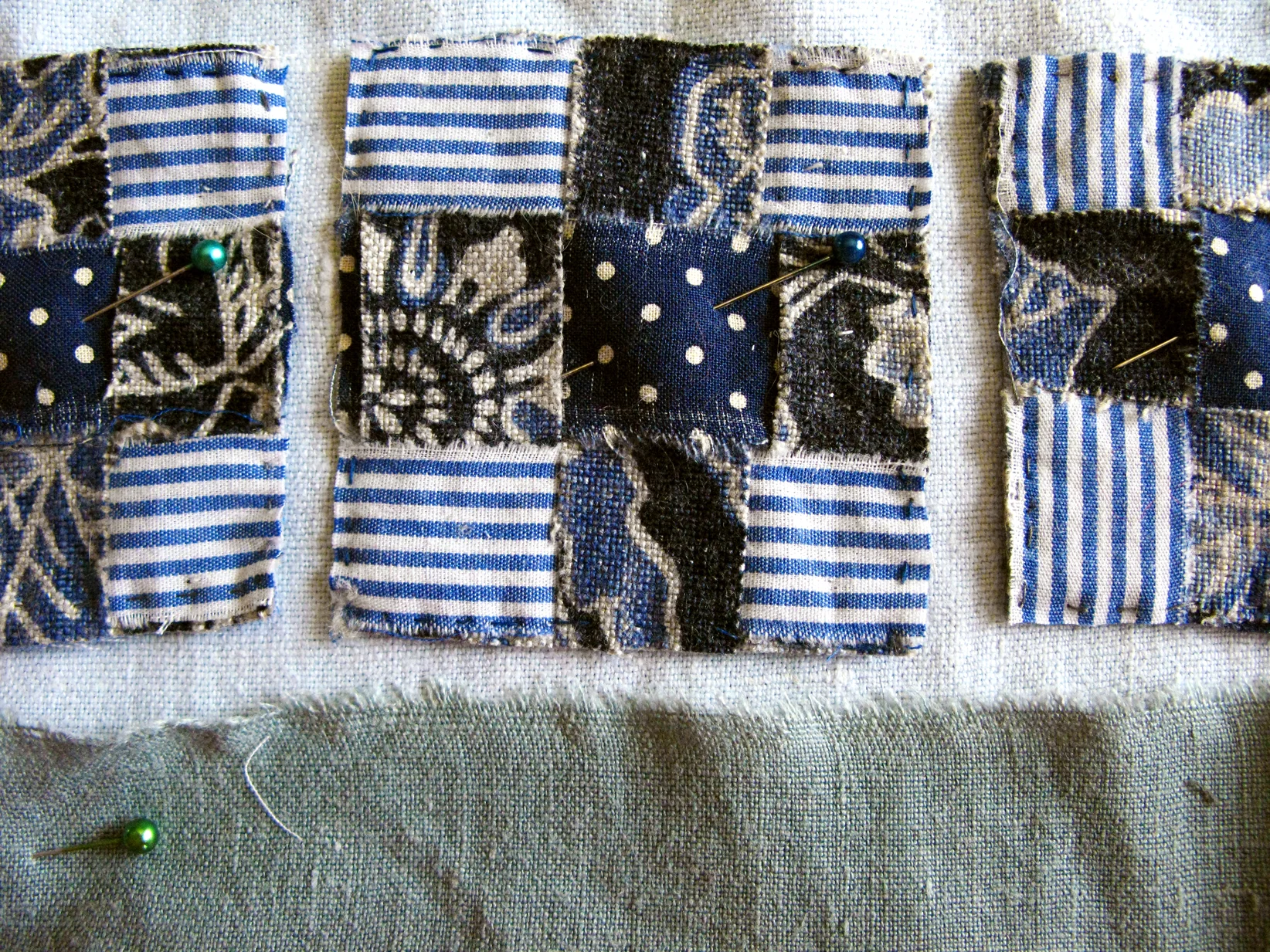 What I'm playing with today: scraps of a linen jacket, Doug's striped shirt, a piece left from making a linen dress for Adeline, a pair of linen pants, some lovely vintage polka dots ... crosses, circles, blue, squares ... linen, stripes, patterns ... groups of three, groups of nine ... some of these elements we find since the beginning of time.