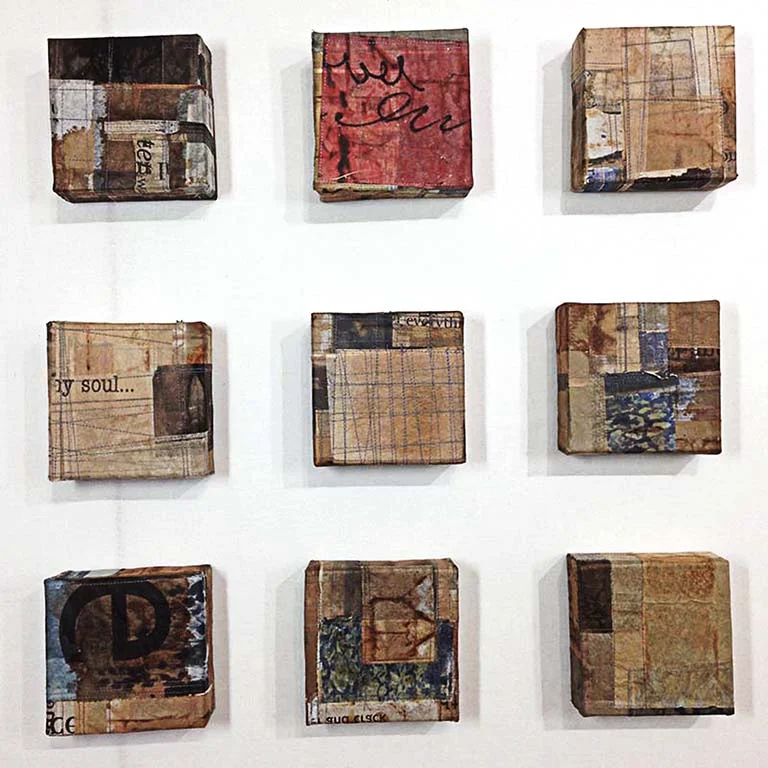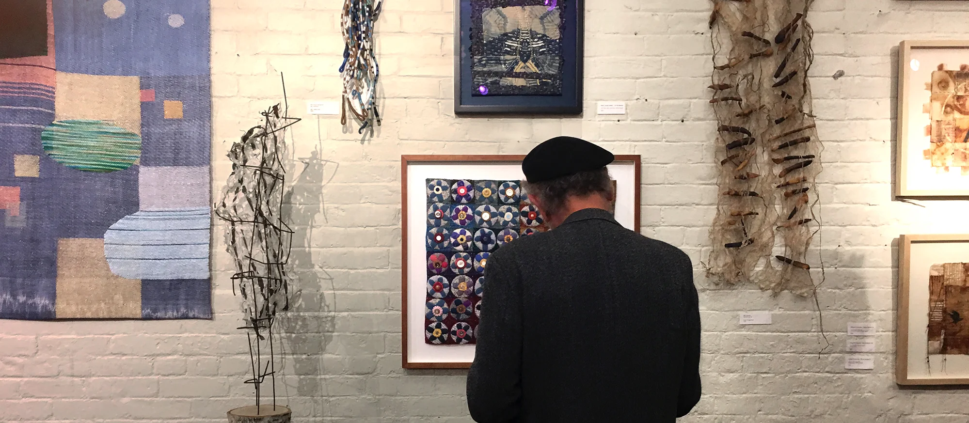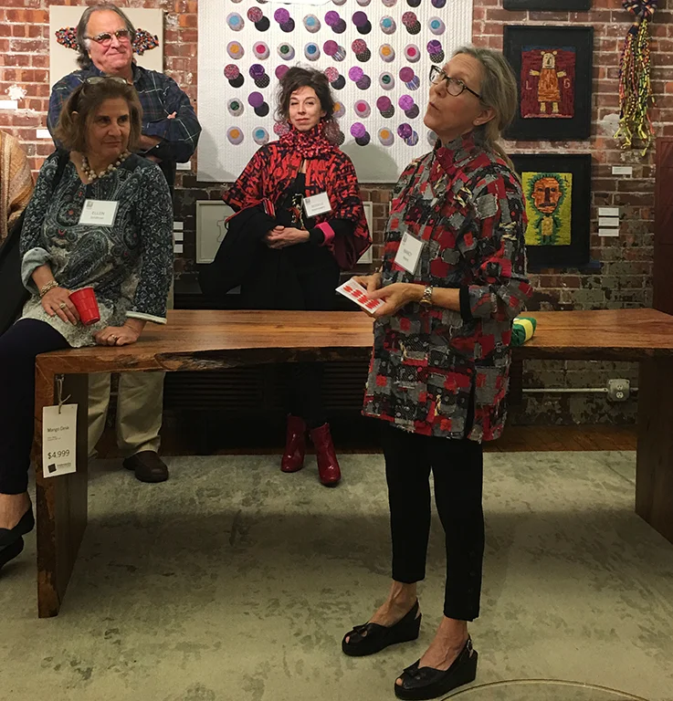 Left to Right: Ellen Schiffman, fiber artist and indefatigable leader of our Connecticut (CT) chapter of the Surface Design Association (SDA); Doug Crites-Moore, maker of truly tiny paper sculptures and my husband of 37 years - he looks like he's wearing awesome earmuffs; Sooo-z Mastropietro, fiber artist extraordinaire; and Nancy Moore, award-winning artist and the very talented and unflappable curator of the Unbound show.