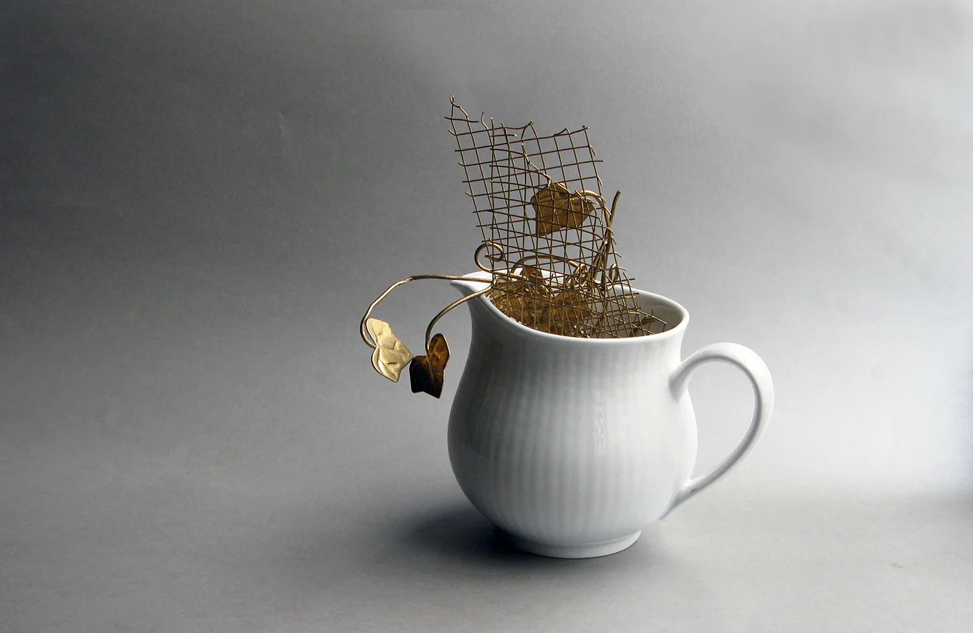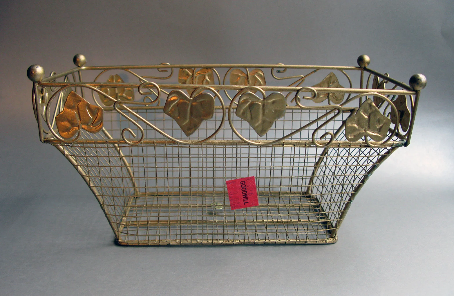 It was Red Tag Day at Goodwill, meaning 50% off anything with a red tag. I was looking for metal that could be used to embellish jewelry and I found this brass basket, for $1.50. The pretty white pitcher is not from Goodwill - it was a gift from a dear friend. I just popped the metal pieces in there to keep them away from the cats. Then I decided I liked the look - a bouquet of weird metal. :-)