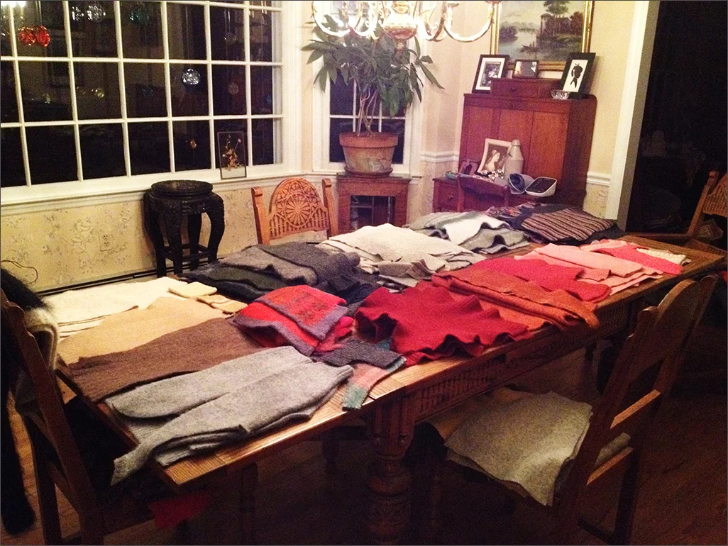 TAKING OVER THE DINING ROOM TO SORT WOOL.