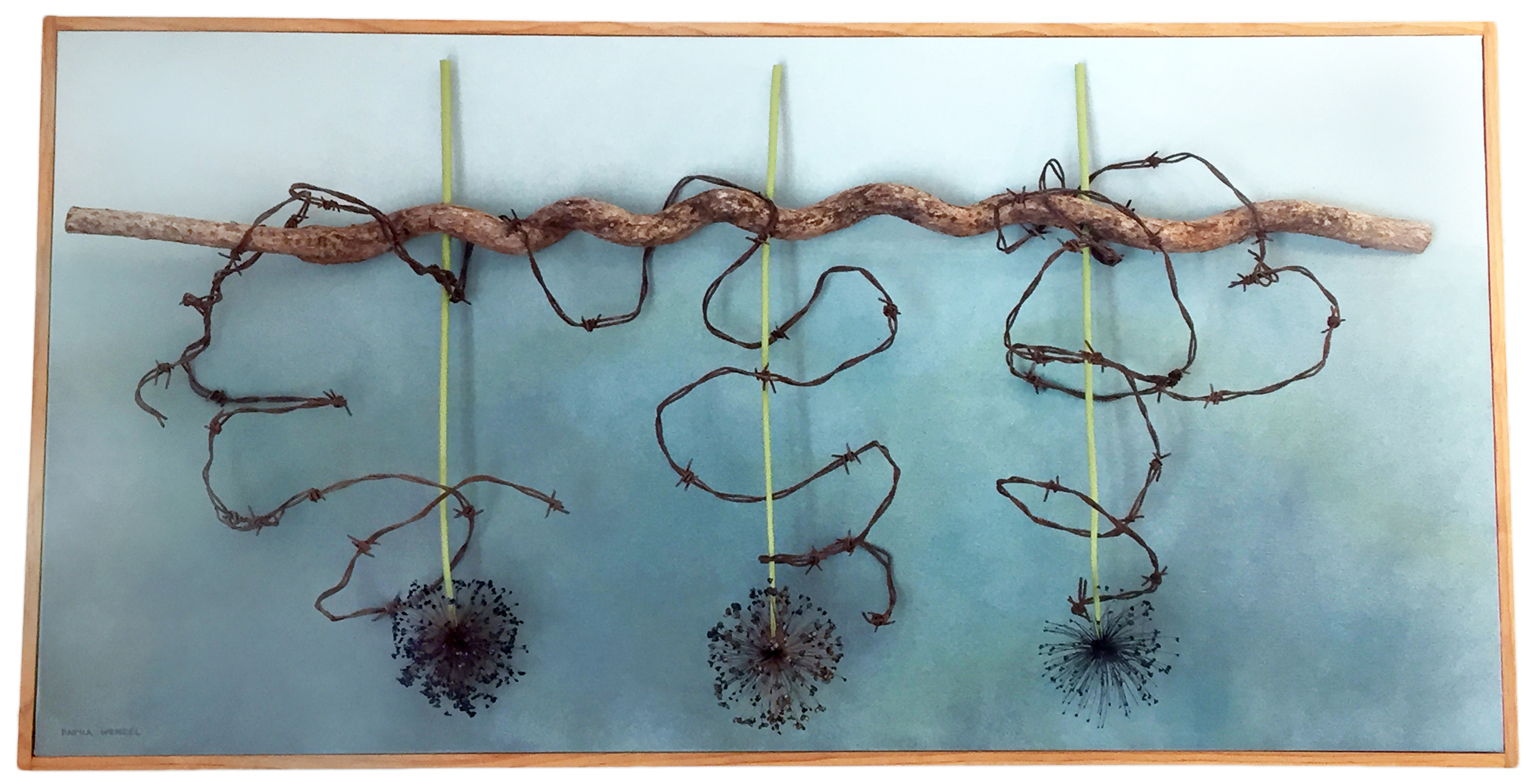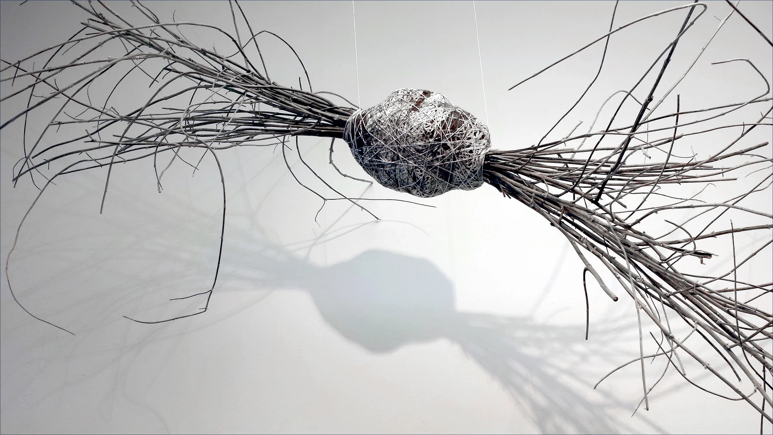 Dayna Wenzel, whose solo exhibition is in the upstairs gallery, met us and a few others and gave us a tour of her show, Nature Unraveled. Dayna creates exquisite sculptural pieces which are composed of natural materials which are often juxtaposed with found objects which others might define as rusty old debris! The results are simply beautiful, as you can see in the piece above.