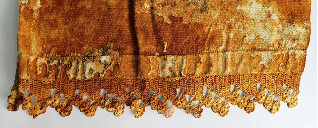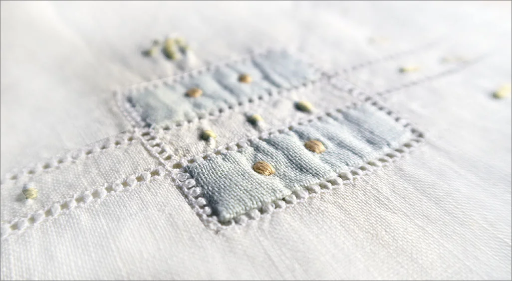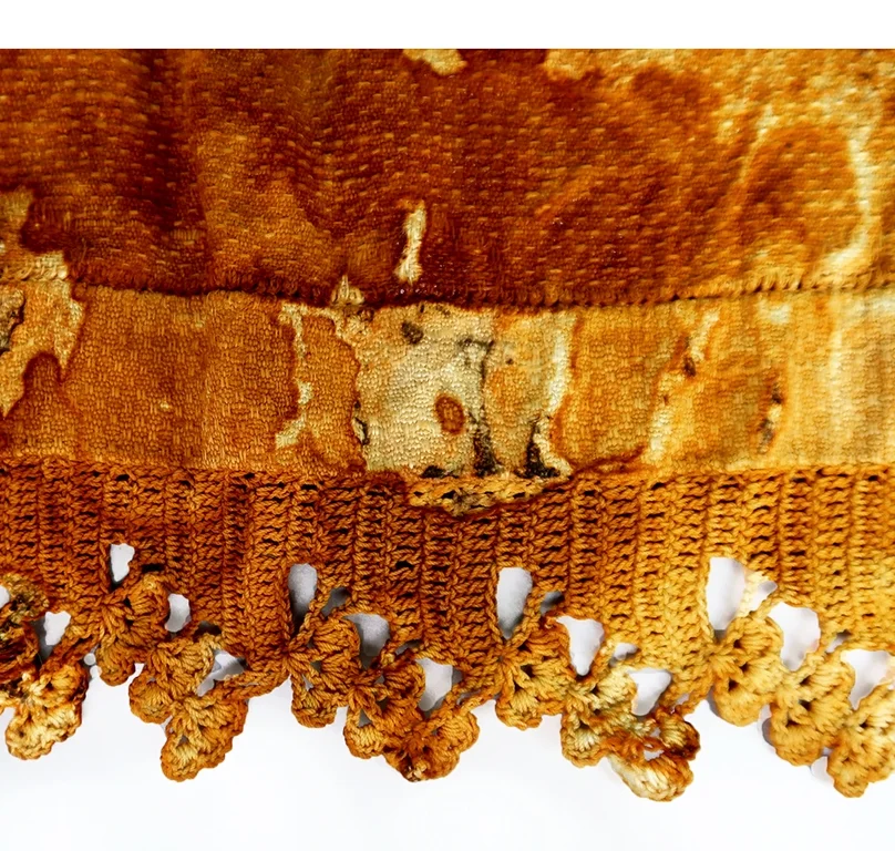 I’ve been holding onto rusted pieces of metal for years ... I have a wonderful old iron pot, suitable for cooking soup for a crowd over an open fire, but horribly - or wonderfully - loaded with rust. If I'm to use it for cooking, I'll need to do some serious re-seasoning. I have some large sheets of rusted metal which used to be a table top. The base of that table, also rusted, is a wonderful curlicue and will live on the deck (probably) once it gets a new top. There are also some interesting pieces of old machinery and several bags filled with small rusted geegaws of one sort or another. Family members look askance and ask, "Do you really need to keep this stuff? Are you ever going to actually do anything with it?" YES! I am definitely going to do something. But I realize, somewhat miserably, I've been uttering this assurance for so long ... Gawd I am a big-time procrastinator! Or, may I say, at least on the question of using rust, I WAS a big-time procrastinator. Because I have now dipped my toe in the water, by dipping my textile in the water, and then laying it on a rusted piece of metal, splashing it with vinegar, covering it with another piece of rusted metal, and forgetting all about it (something procrastinators are good at) for a while.